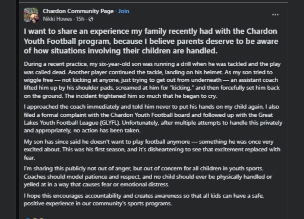 Nikki filed a formal complaint. She contacted the Chardon Youth Football board. She also reached out to the Great Lakes Youth Football League (GLYFL).