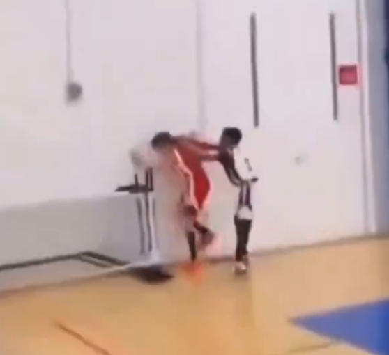 The video begins during a youth basketball game in 2024. Two kids—one in a white jersey and another in red—get into a heated altercation on the court.