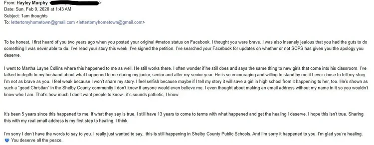 “Chris Gaither used his position of power as a teacher and coach to groom me for two years,” she writes in her letter. llowing him to go back into the classroom would be a huge disservice to me, the girls who have similar stories, and future female students.”