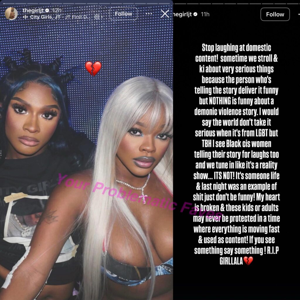 Rapper JT is speaking out against users who consume and laugh at content about domestic violence after the death of her friend.