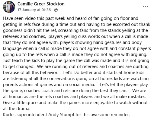 Camille Greer Stockton, who shared the post on Facebook, described recent troubling scenes she’s witnessed or heard about, fans storming the floor to confront referees during timeouts, screaming from the stands directed at officials and coaches, players cursing or using disrespectful gestures when disagreeing with calls, and constant arguing with refs.