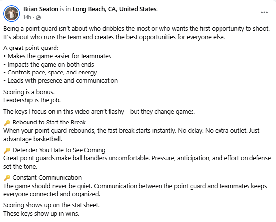 In his recent Facebook post, Seaton breaks it down plainly, being a point guard isn’t about who handles the ball the most or who hunts for the first shot.